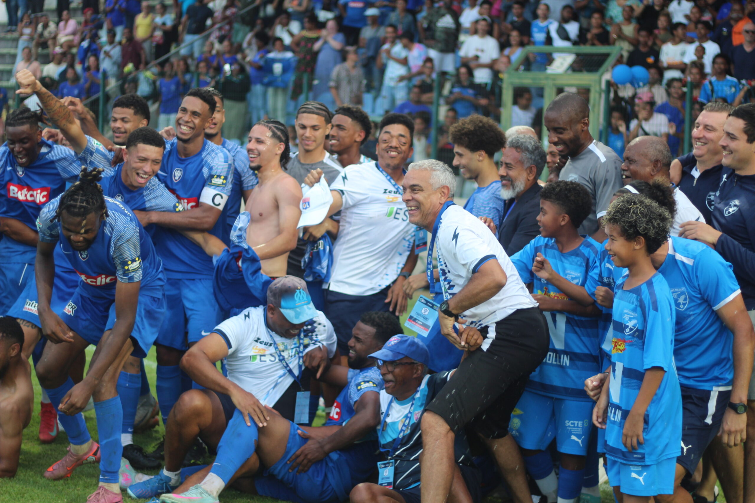 Dans les tribunes, l’ambiance montait encore d’un cran, portée par le kop saint-paulois. Le stade se remplissait à l’approche du coup d’envoi et plus de 3 500 spectateurs prenaient place dans les travées. Chapeau à l’organisation pour le déroulement sans encombre de cette finale, disputée dans un état d’esprit irréprochable. Les premiers magistrats des deux communes — Emmanuel Séraphin pour Saint-Paul et Mathieu Hoarau pour l’Étang-Salé — ont salué joueurs, entraîneurs et supporters. Et pour couronner cette fête, trois invités de prestige ont donné le coup d’envoi fictif : Guillaume Hoarau, Laurent Robert et Ludovic Giuly, tous trois passés par le Paris Saint-Germain. La rencontre pouvait alors débuter.